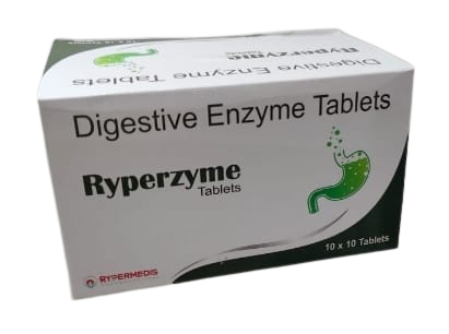 Ryperzyme is a digestive enzyme supplement formulated to support healthy digestion and improve nutrient absorption. It helps relieve indigestion, bloating, and discomfort caused by enzyme deficiency, ensuring better gut health and overall wellness.